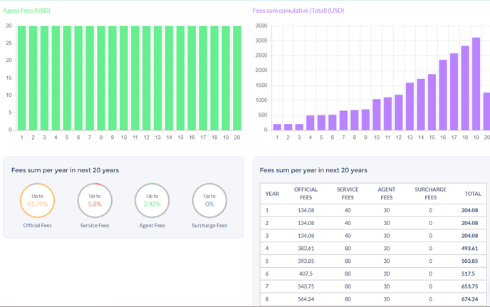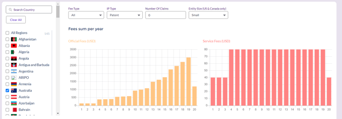 This allows you to select region(s) of your choice, the IP Type, claims and entity size in order to get a forecast of renewal fees broken out by cost types (official, agent, and service fees).